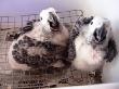 A fêmea tem microchip, o macho anilha, o macho está depenado no peito.