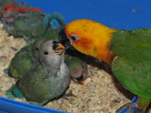 Pichones de Agapornis Roseicollis y Aratinga Jendaya, preciosa foto propiedad de Tamara Machon Lopez
