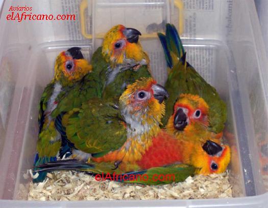 Pichones de Aratinga Solstitialis y Jendaya jugando antes de comer